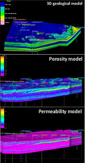 In parallel with the sedimentological and stratigraphic outcrop study, a review of the diagenesis which affected the carbonates is proposed so as to understand porosity and permeability distributions. Routine Core Analysis data and well log petrophysical data are integrated within the geological model to build a static model.