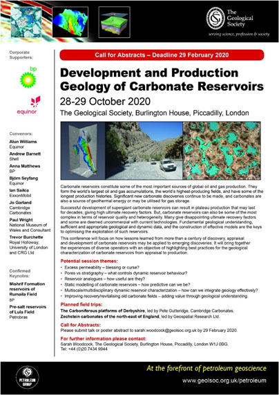 In October this year, Jo Garland will be co-convening a Geol Soc conference on the Development and Production Geology of Carbonate Reservoirs. Please submit talk or poster abstracts to sarah.woodcock@geolsoc.org.uk by 29 February 2020. There will be two associated field trips, one of which will be led by Pete Gutteridge: The Carboniferous platforms of Derbyshire.